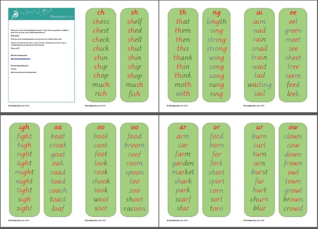 Free printable download – wordlists for practicing isolated sounds. Phase 3 letters and sounds. 4 per page